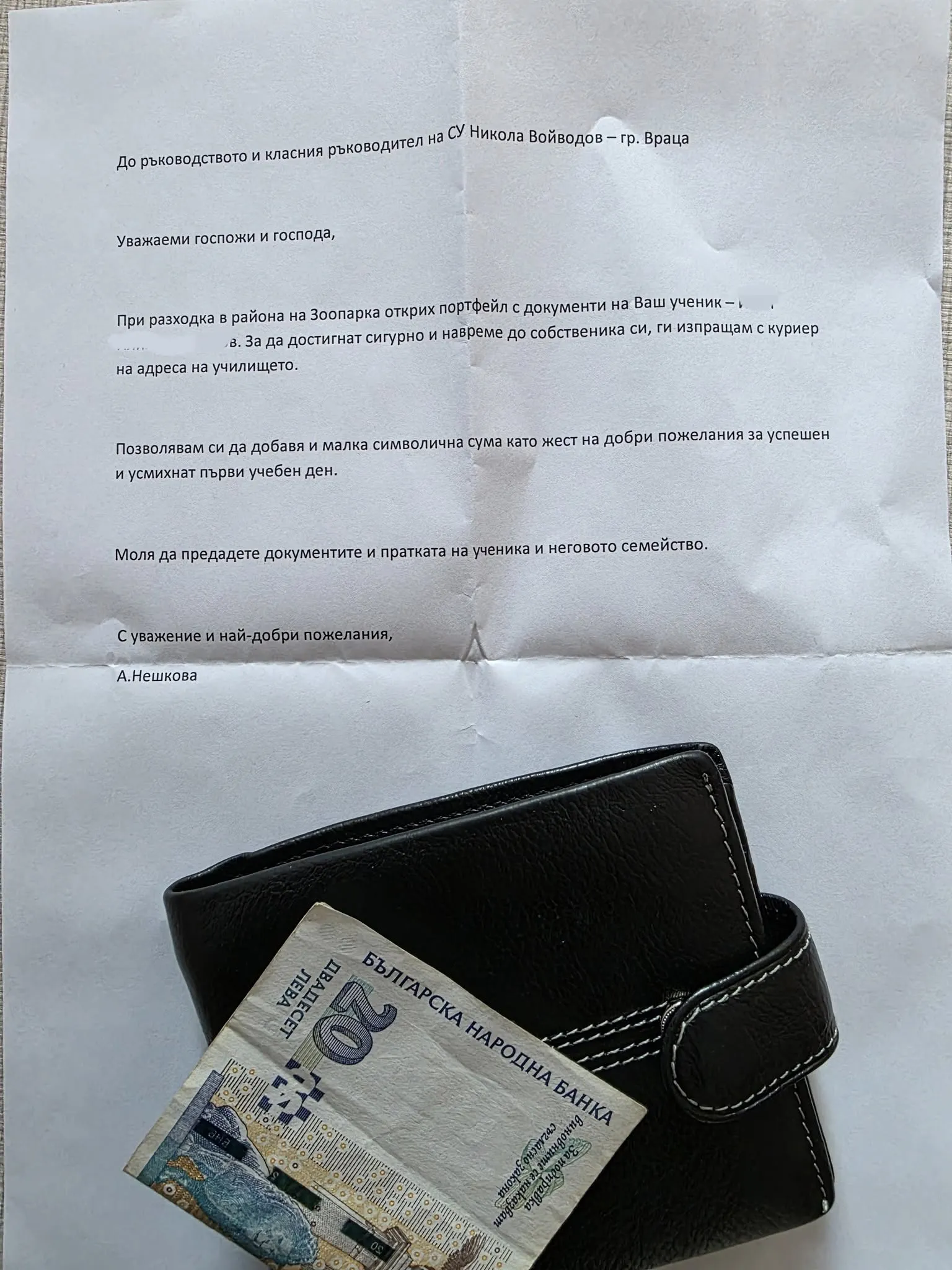 Ученик на учебното заведение изгубил портфейла си с документи, а жена на име А. Нешкова показала изключителна доброта, като го намерила и решила да го върне по най-сигурния метод.