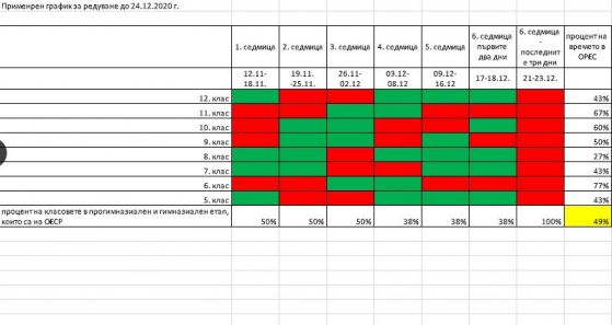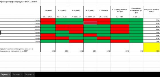 В алено са дните с отдалечено образование, в зелено - с присъствено.