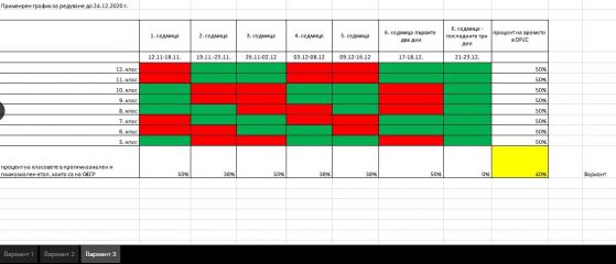 Министърът предлага три разновидността, които могат да бъдат основа за взимане на решение за периодично повтаряне на образованието в електронна среда с присъствено. Възможни са и други разновидности, препоръчани от РУО в съответната област, прецизира той.