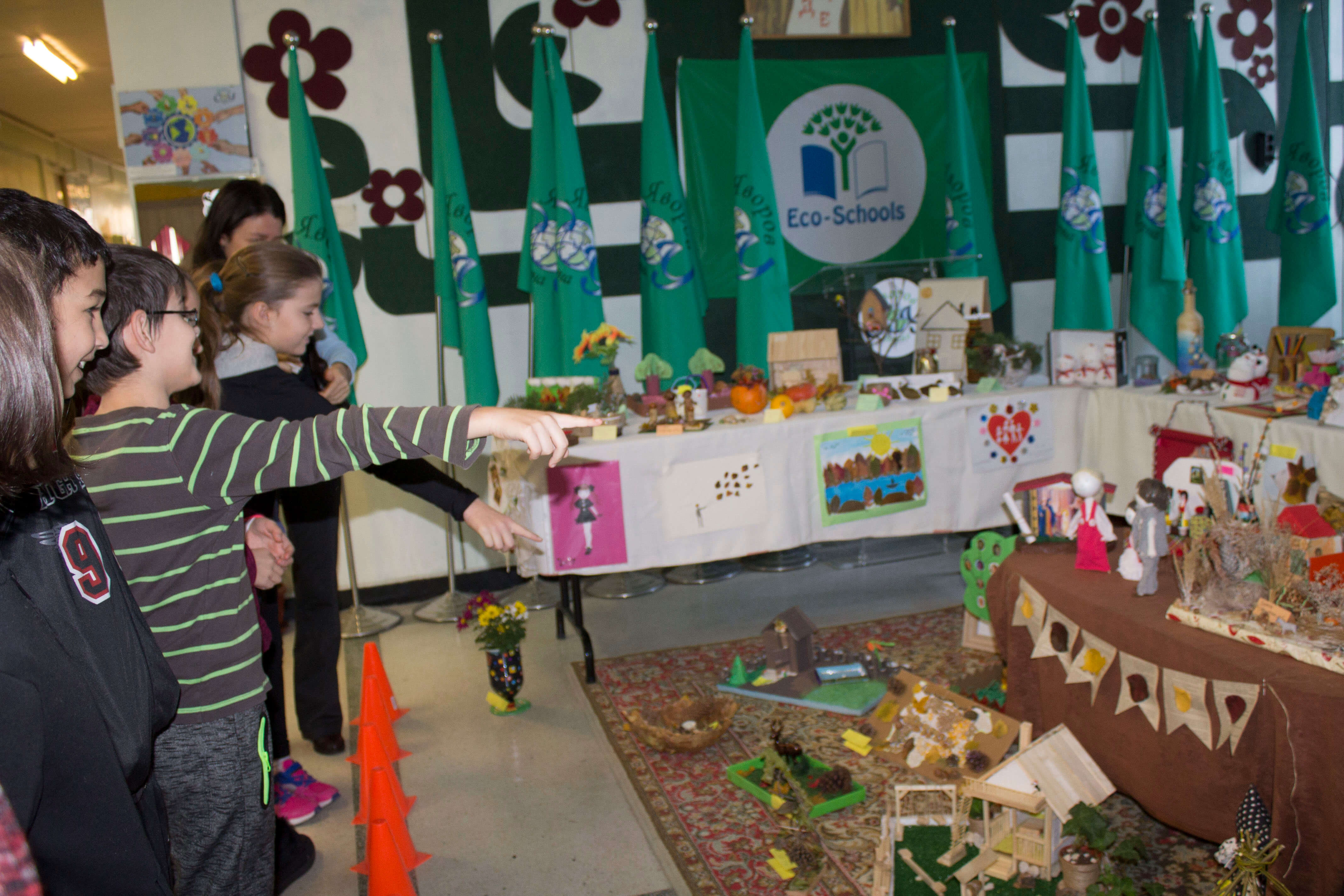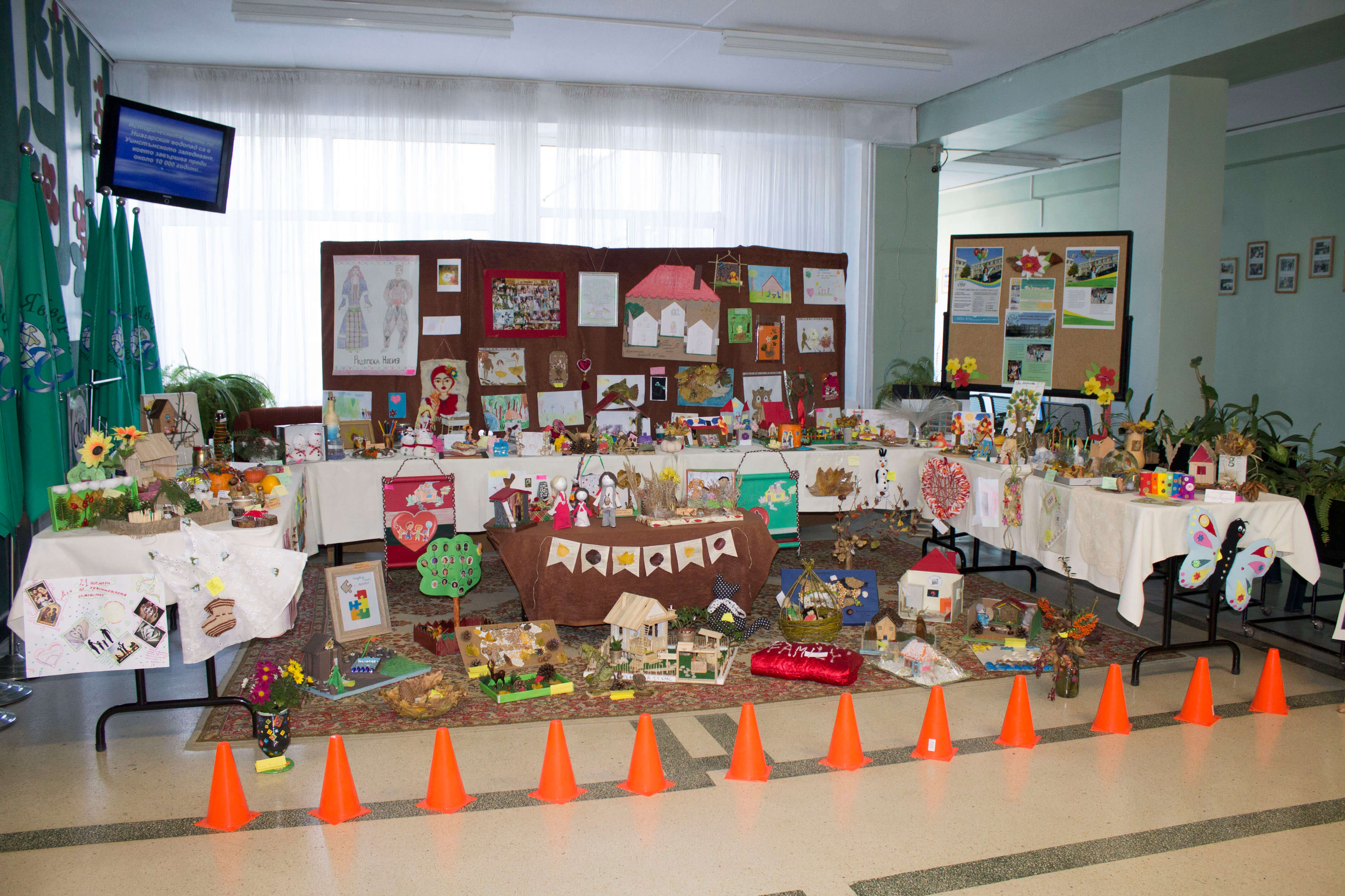 прежда и конци украсиха празнично фоайето на учебното заведение. Изложбените експонати бяха направени от учениците благодарение на техните родители като знак на уважение към фамилните полезности.
