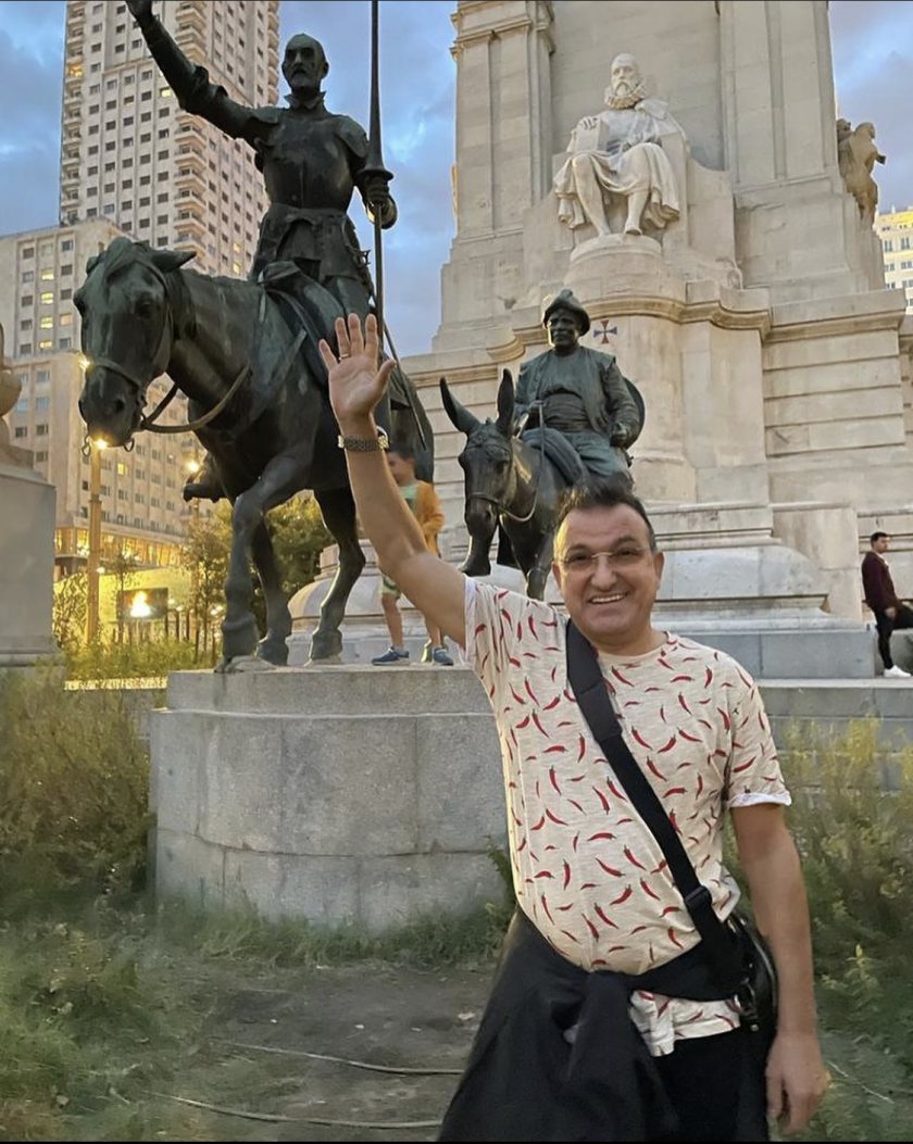 Актьорът и художник пусна и няколко фотоси в обществените си мрежи от Мадрид, на които театралничи с известния монумент на Дон Кихот и Санчо Панса. “В Мадрид при стааааарите другари ”, написа Васил Василев-Зуека към обявата си. Впрочем обликът на Дон Кихот неведнъж участва в платната на Васил Василев.