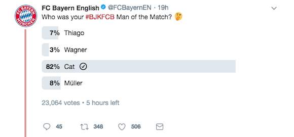 След дуела пък котката беше определен за “Играч на мача” в анкета на профила на Байерн в Twitter.