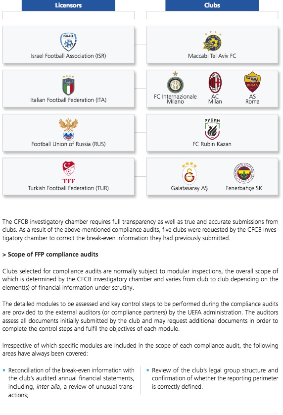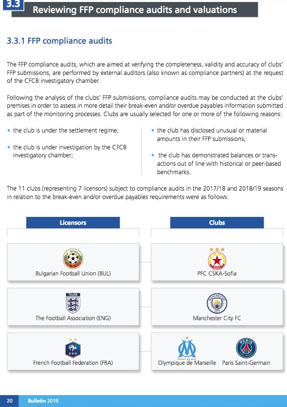 Чрез него проверяващата камара на УЕФА за финансов надзор на клубовете (CFCB) осведоми, че 11-те клуба, подлежащи на одити за сходство през сезоните 2017/2018 и 2018/2019, са както следва:
