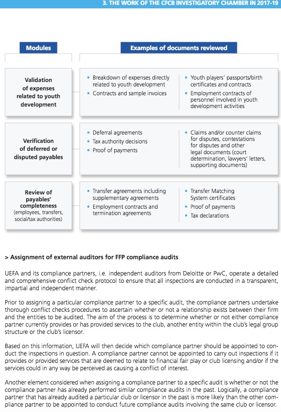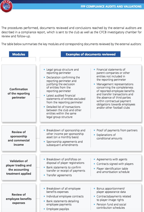 Представителите на УЕФА ревизират финансовите доклади, транзакциите сред клубовете и други субекти в границите на една и съща правна конструкция, а също по този начин и финансовите доклади на сдруженията майки или други формирания, които не са включени в отчитащия се периметър. В инспекциите влизат и договорните отговорности и заплащания към чиновници и/или футболни клубове, спонсорски контракти, съглашения за трансфер, банкови извлечения за удостоверение, съглашения с сътрудници, подписани контракти с играчи и доста други неща.