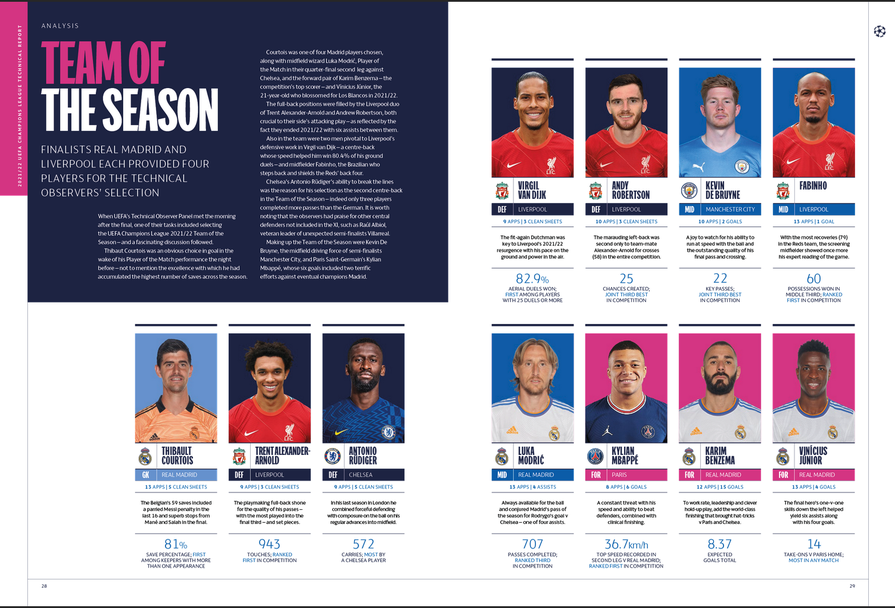 Очаквано в състава има най-вече представители на финалистите в последното издание на Шампионската лига. Реал Мадрид и Ливърпул имат по четирима играчи в тази селекция. Тибо Куртоа, Лука Модрич, Карим Бензема и Винисиус Жуниор са представителите на спечелилия в шампионата. Трент Александър-Арнолд, Вирджил ван Дайк, Андрю Робъртсън и Фабиньо са футболистите от Ливърпул. Антонио Рюдигер (Челси), който от новия сезон също е състезател на Реал, Кевин де Бройне (Манчестър Сити) и Килиан Мбапе (ПСЖ) са единствените футболисти, които не са играчи на тимовете, стигали до мача за трофея през май.