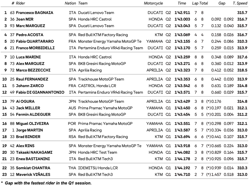 Трети на старта ще застане Марк Маркес, който беше с 0.132 по-бавен от своя съотборник Баная. Четвърти остана Педро Акоста, който действително направи единствено една серия от обиколки, откакто механически проблем го принуди да се прибере в бокса още в края на първия му загряващ тур при започване на втората фаза на квалификацията.