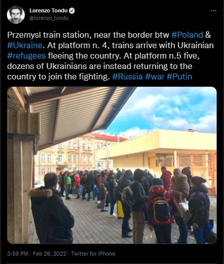 Украинци, живеещи в Полша, се връшат в страната, с цел да се бият, до момента в който други бягат. Това написа в своят Туитър акаунт Лоренцо Тодо.
