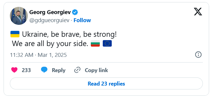 С тези думи министър Георгиев изрази поддръжка за президента на Украйна Володимир Зеленски измежду вчерашната му среща с водача на САЩ Доналд Тръмп в Белия дом.