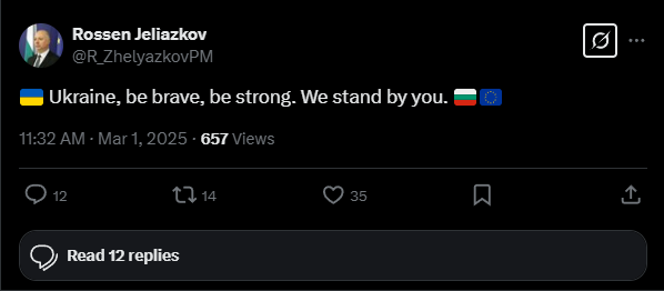 “Украйна, бъди смела и мощна. Ние сме с теб! ”, това написа през днешния ден министър председателят Росен Желязков в профила си в обществената мрежа “Екс ”.