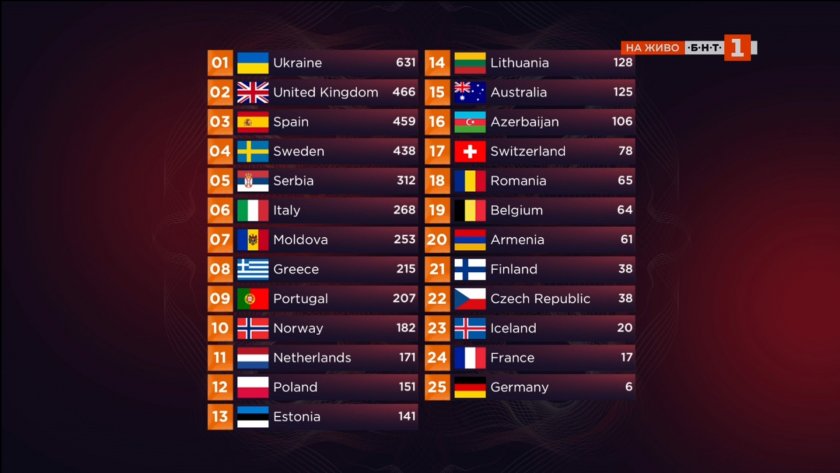 С най-вече от гласовете от телевота на публиката Украйна завоюва първото място.