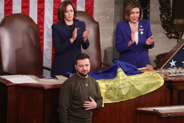 След речта Зеленски подари украинско знаме отград Бахмут в Източна Украйна катознак на признателност за поддръжката на Съединени американски щати. Вицепрезидентът Камала Харис и някогашният ръководител на Камарата на представителите Нанси Пелоси подвигнаха знамето.В подмяна Зеленски получи американско знаме.