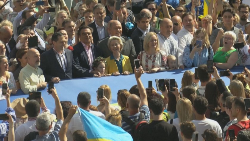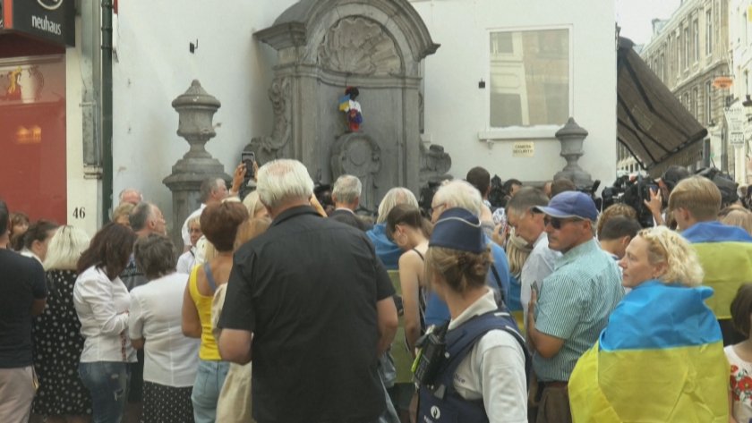 В Брюксел европейските институции блестнаха в цветовете на украинското знаме. Председателят на Европейската комисия Урсула фон дер Лайен взе участие в демонстрация в центъра на белгийската столица, където алегорично беше разпънат голям украински байрак. Най-известната скулптура в Брюксел беше облечена в обичайната украинска носия.