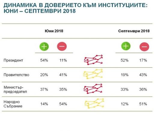 Правителството отбелязва спад от 1% и растеж в отрицателните оценки от 41% до 43%. Същият тренд бележи и персоналният рейтинг на министър ръководителя (редуциране на доверието от 37% на 33%, с което се връща на равнищата от месец март).