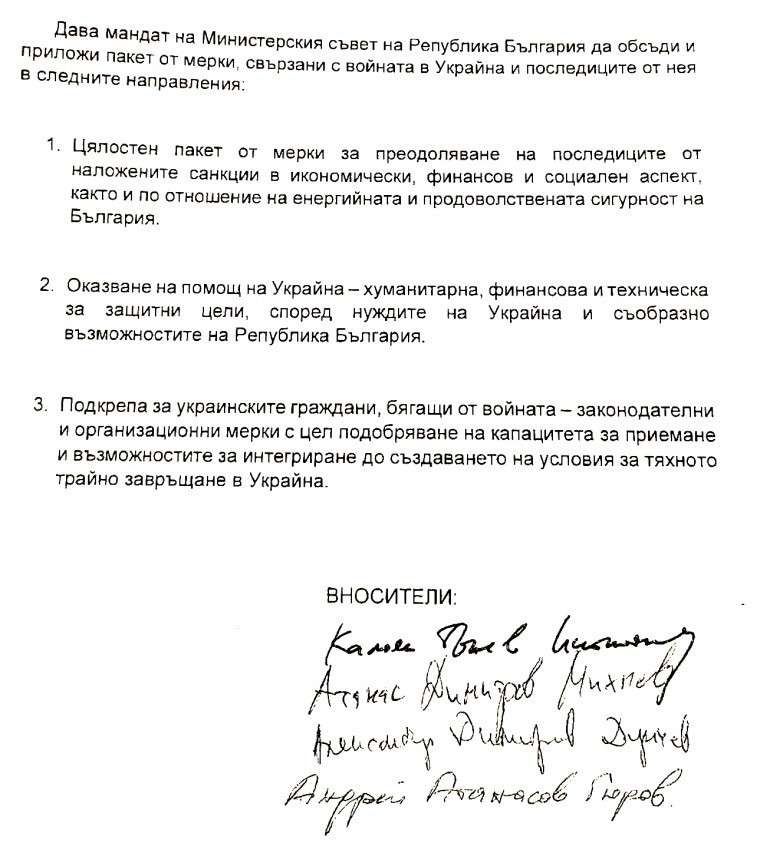 Политическа партия внесе контрапредложение на плановете на ГЕРБ и Демократична България за даване на военна помощ за Украйна. В него липсва думата „ военна “, която е сменена с „ техническа “, което завоюва утвърждението на Българска социалистическа партия.