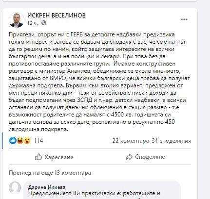 Веселинов заяви, че с финансовия министър Кирил Ананиев е контрактувано всички деца да получават поддръжка от страната. Той изясни, че се върви към втори вид, препоръчан преди дни - фамилиите с ниски приходи да бъдат подпомагани с детски надбавки, а всички останали да получат данъчни облекчения в същия размер.