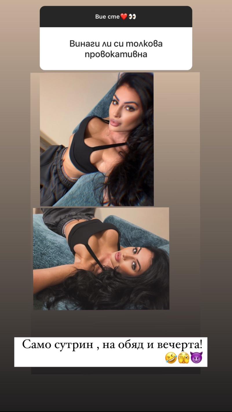 Венцислава Тафкова призна, че го прави заран, на обяд и вечерта. Така пловдивската миска отговори на въпрос на собствен почитател постоянно ли е толкоз провокативна. И с цел да илюстрира образно, тя добави HOT фотография, на която се е излегнала предизвикателно по този начин, че цялото внимание на почитателите да е ориентирано към сексапилния й бюст.