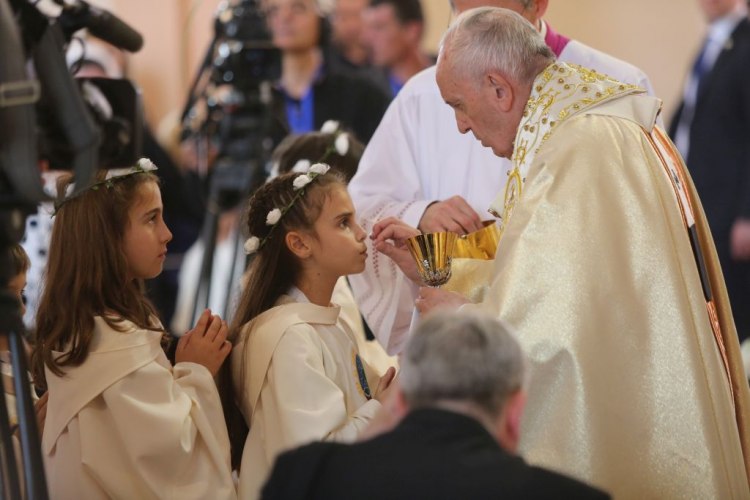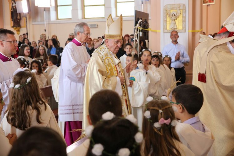 Там папа Франциск даде първо причестяване на 250 деца в църквата „ Пресвето Сърце Исусово. “ И им напомни „ Нашият закон е любовта “.