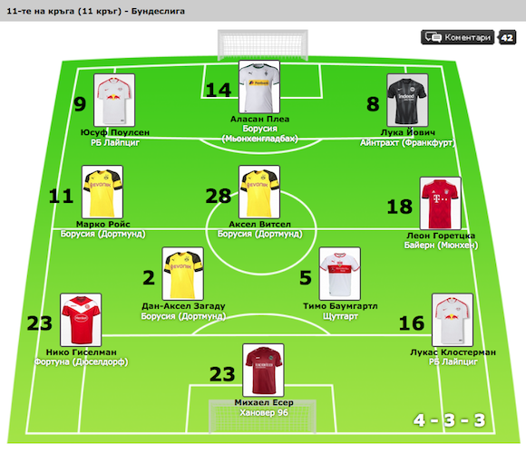 Успехът на Борусия (Дортмунд) с 3:2 над Байерн (Мюнхен) е акцентът от миналия 11-и кръг в Бундеслигата. Победата затвърди моментното предимство на вестфалци, което се видя и на терена. Очаквано “жълто-черните” са с най-вече представители в идеалния тим на кръга на Sportal.bg - Марко Ройс, Аксел Витцел и Дан-Аксел Загаду. Тримата бяха част от централната ос - бранител, отбранителен халф и атакуващият полузащитник зад острието на върха, с които баварците не съумяха да се оправят. И въпреки всичко мюнхенци също се показаха добре, като от тях отличаваме Леон Горетцка поради неизчерпаемата му сила да снове сред двете наказателни полета.