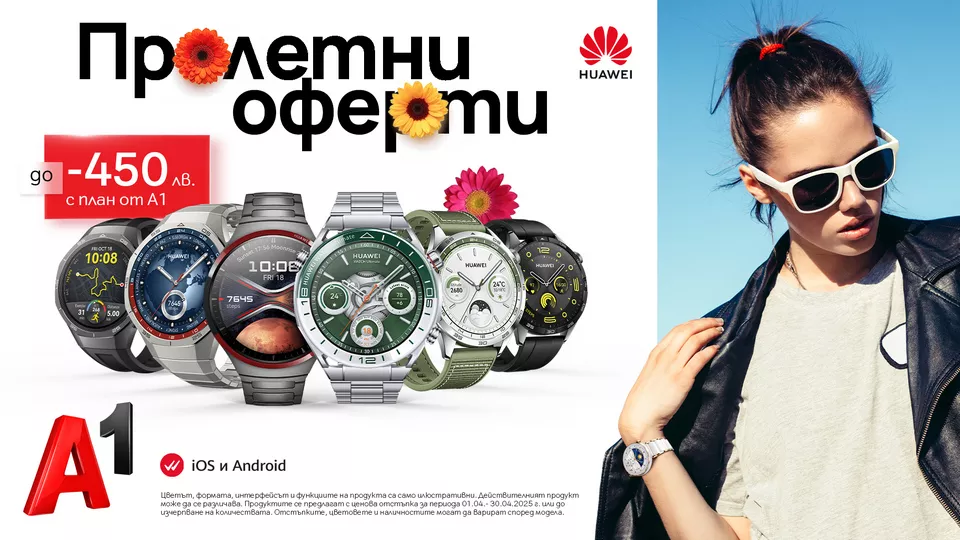 През април А1 България предлага специфична пролетна селекция смартчасовници на Huawei с до 450 лева отстъпка при покупка в брой с проект Unlimited Ultra. Промоцията включва многообразие от модели като Huawei Watch Ultimate, Huawei Watch GT5 Pro, Huawei Watch GT4 и други.