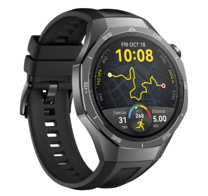 Моделът Huawei Watch GT 5 Pro 46 mm съчетава грациозен дизайн с усъвършенствани функционалности, ориентирани към дейния консуматор. Kорпусът му е направен от титаниева сплав от аерокосмически клас и рамка от нанокристална керамика. 1,43-инчовият AMOLED екран с резолюция 466×466 пиксела предлага живи цветове, явен контрастност и отлична видимост при всевъзможни условия – от директна слънчева светлина до липса на такава.