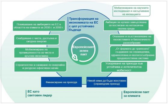 Трите огромни цели са към 2050 година да няма чисти излъчвания на парникови газове, икономическият напредък да бъде обособен от потреблението на запаси и в това време да няма хора и райони, ощетени от зеления преход. Няма бранш на стопанската система и област от живота ни, които да не са наранени от тази дълбока смяна. Сред, заложени от Европейската комисия са: