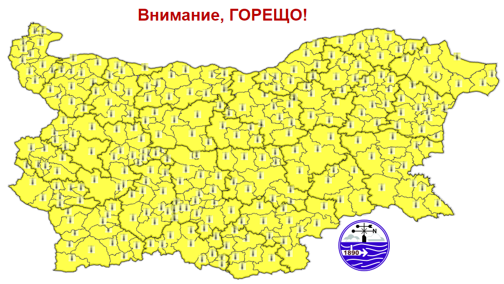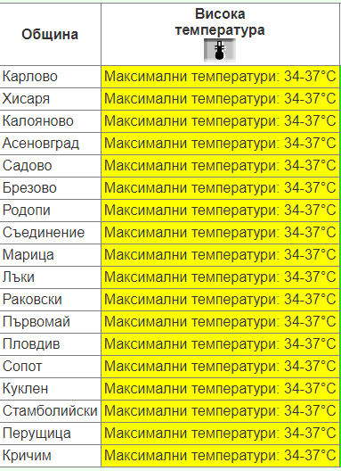 Утре ще бъде слънчево и топло. Ще духа слаб до сдържан вятър от южната четвърт. След обяд ще е горещо с оптимални температури сред 33° и 38°, тук-там в Горнотракийската равнина и по-високи, в Пловдив - към 34°. От Национален институт по метеорология и хидрология оповестиха жълт код за високи температури за цялата страна.