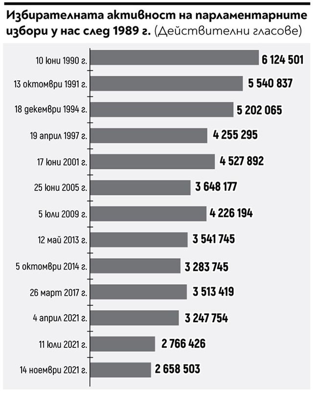 Според предварителната оценка на Национален статистически институт популацията в България е 6,5 млн. души, а по отношение на предходното броене през 2011 година сме намалели с 11%, или към 844 000 души. Въпреки това през ноември 2021 година от ЦИК оповестиха, че право на глас имат малко над 6 708 000 души. На какво се дължи огромната разлика в числата?