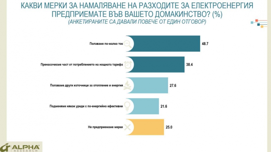 38% пък пренасочват също към прилагане на нощната цена, 28% пък употребяват други източници за отопление и сила, а 22% подменят някои уреди с по-енергийно ефикасни.