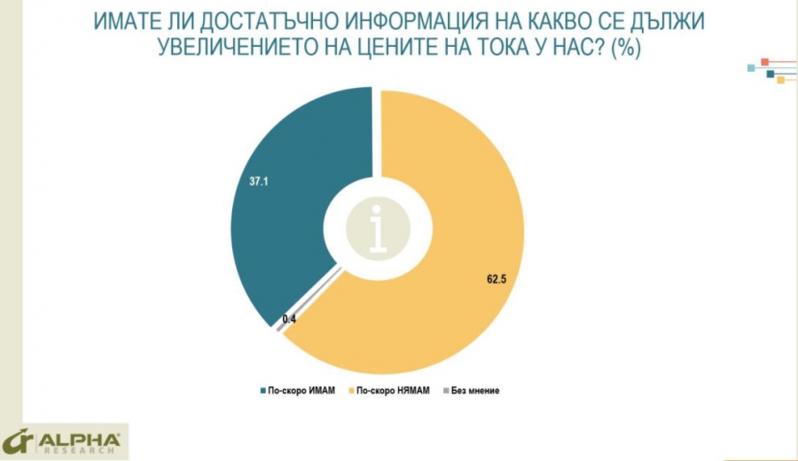 Причините за нарастването цената на тока остават неразбираеми за 63%. На противоположното мнение, определяйки се като осведомени, са 37%. Само по себе си това е сериозен проблем пред информационната политика на държавното управление, защото рецесия, която касае огромната част от българските семейства и директно въздейства върху бита и потреблението им, продължава да е с неизяснени аргументи. Респективно, когато не знаят предпоставките, хората не могат да оценят верни, или неправилни са предприеманите ограничения.