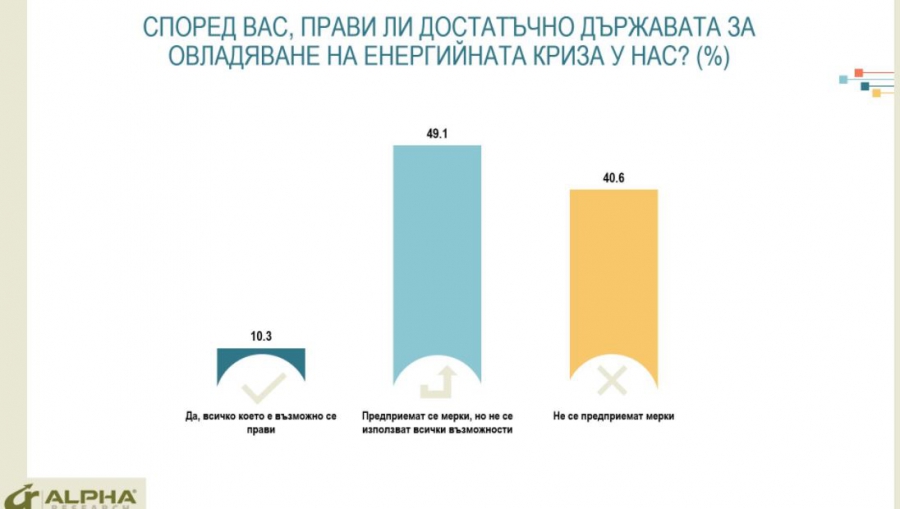 Изцяло положителна оценка показват едвам 10%. Доминира настройката, че се вършат обособени неща, само че не се употребяват всички благоприятни условия (49%). Значим е делът и на най-недоволните и ощетените, съгласно които страната не подхваща ограничения (41%). Бъдещ растеж в отрицателните оценки за ролята на ръководството в оправянето в енергийната рецесия може да докара и до обществено напрежение с мъчно предвидими резултати, разясняват социолозите.