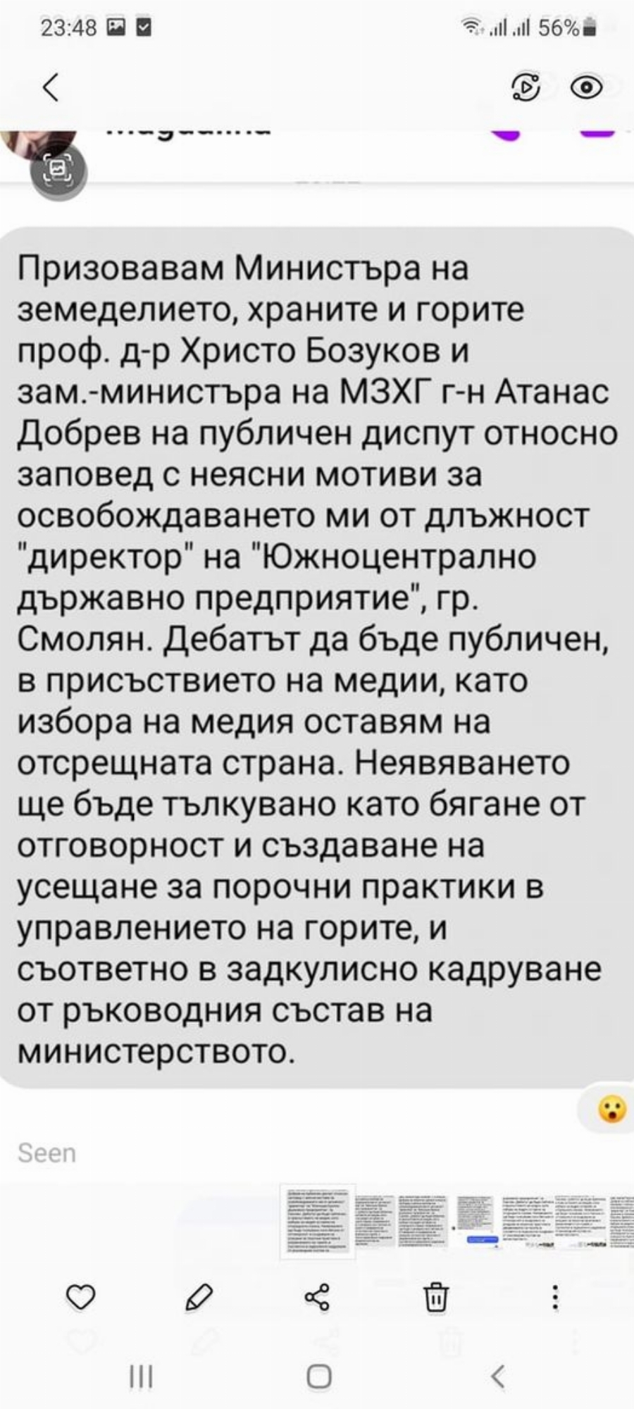 Уволненият през вчерашния ден шеф на Южноцентралното държавно дружество в Смолян инж. Ботьо Арабаджиев кани на обществен дебат министъра на земеделието, горите и храните проф. доктор Христо Бозуков и заместника му Атанас Добрев.
