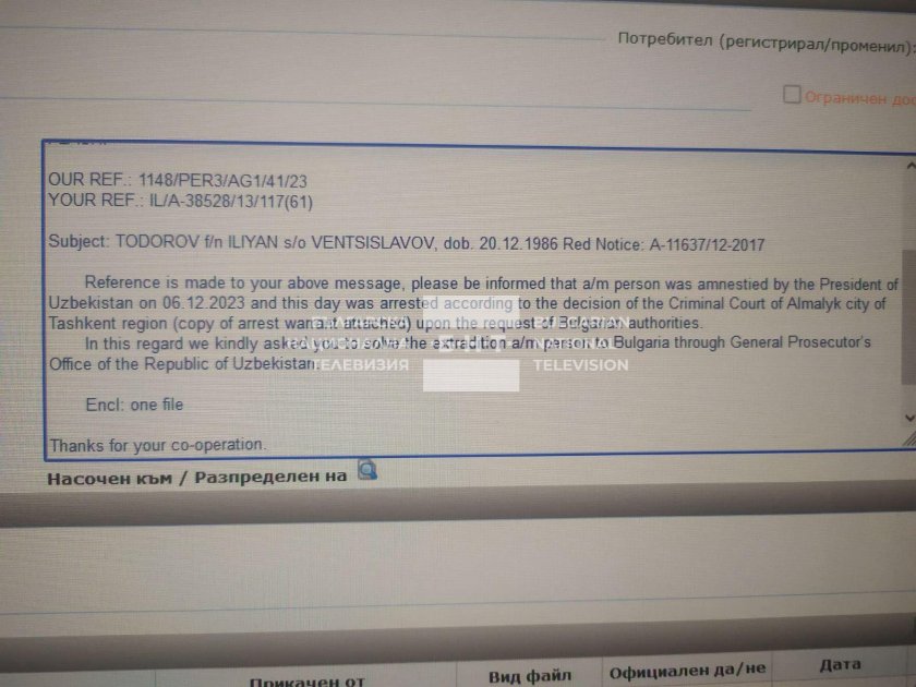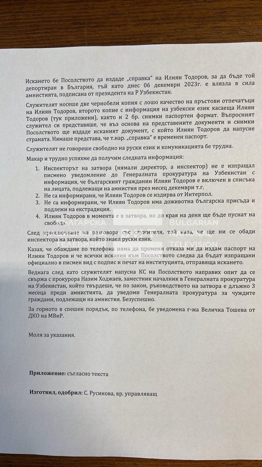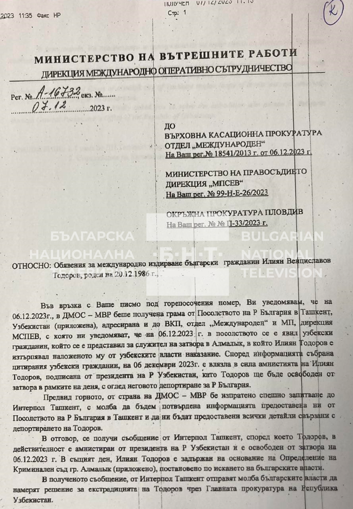 Тогава дирекция " Международно оперативно полицейско съдействие " в Министерство на вътрешните работи изпращат незабавно питане за случая до бюрото на Интерпол в Ташкент. От там неотложно дали отговор, че на 6 декември 2023 година българският жител Илиян Тодоров е освободен от пандиза в Алмалъйк и неотложно е арестуван по настояването на България за екстрадиция. От Интерпол - Ташкент са поискали от офиса на основния прокурор в България неотложно да придвижат документите за екстрадиция посредством Главната прокуратура на Република Узбекистан.