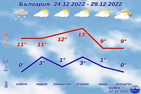 На Коледа облачността още веднъж ще се раздра и ще намалее, вятърът ще отслабне, в доста региони до вечерта ще стихне. Минималните температури ще са сред 0° и 5°, дневните - съвсем без смяна. През първата половина от новата седмица вероятността за превалявания остава доста дребна.