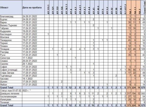 Пробите са взети от пациенти в интервала 17-30.01.2022 година и са изпратени от 44 разнообразни лечебни заведения от 24 области на страната.