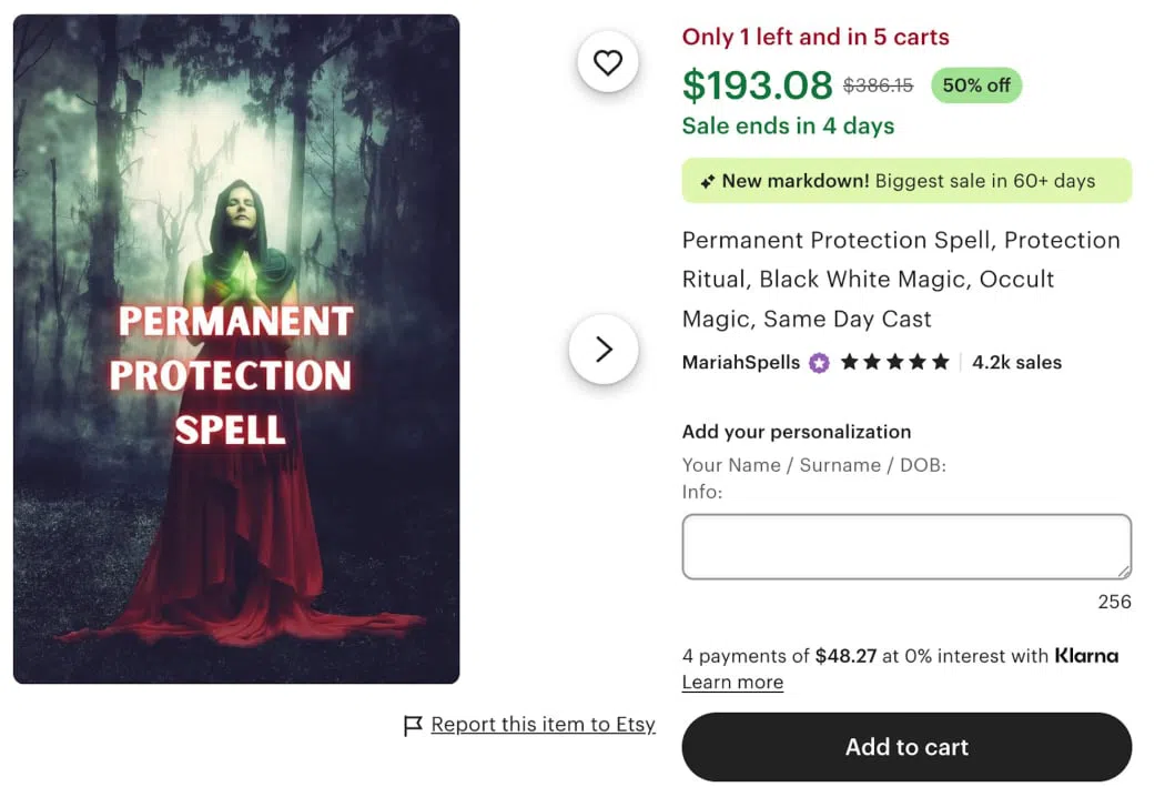 Профилът MariahSpells има над 4000 продажби и рейтинг 4.9, като предлага защитно проклинание за към 200 $. Друг профил – Spells by Carlton – има над 44 000 продажби и предлага проклинание за „ връщане на някогашния “ за към 7 $.