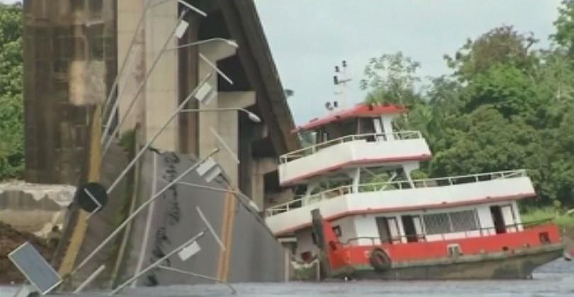 В бразилския щат Пара част от мост се срути, откакто в него се удари ферибот. Рухнала е права с дължина към 200 м. Според очевидци, сега на рухването по моста са се движили две коли. Не е ясно има ли жертви и какъв брой са те. Местни медии настояват, че петчленният екипаж на ферибота е оживял.