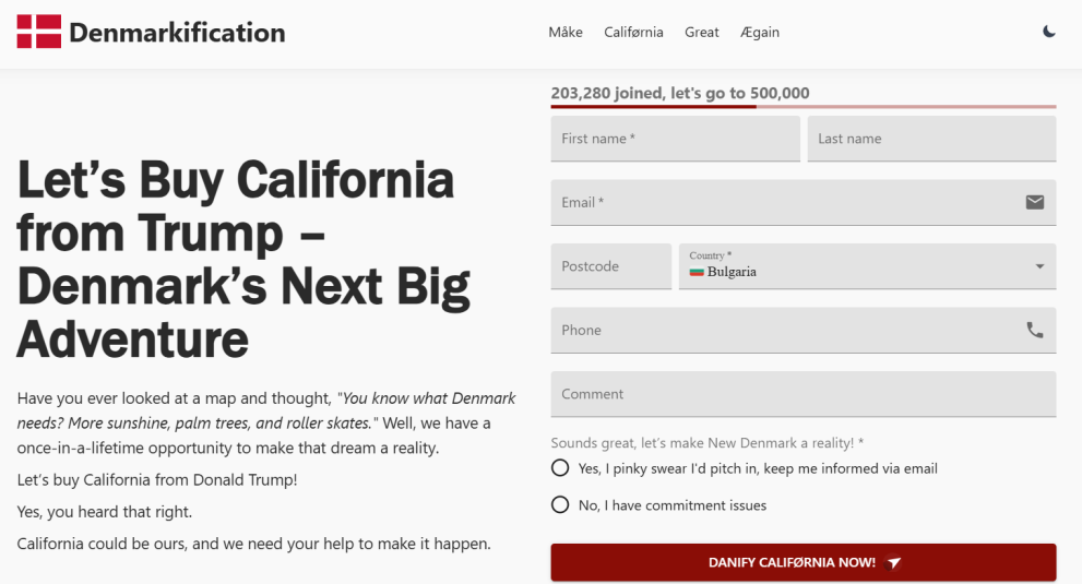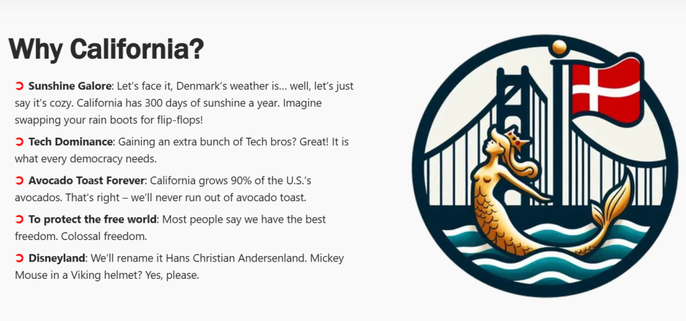 В горната част на уеб страницата уредниците приканват към „ Måke Califørnia Great Ægain “ (Да създадем Калифорния велика отново), а хипотетични поддръжници като Ларс Улрих от Metallica и Виго Мортенсен , прочут от „ Властелинът на пръстените “, споделят своите доводи за превръщането на Калифорния в „ Нова Дания “.