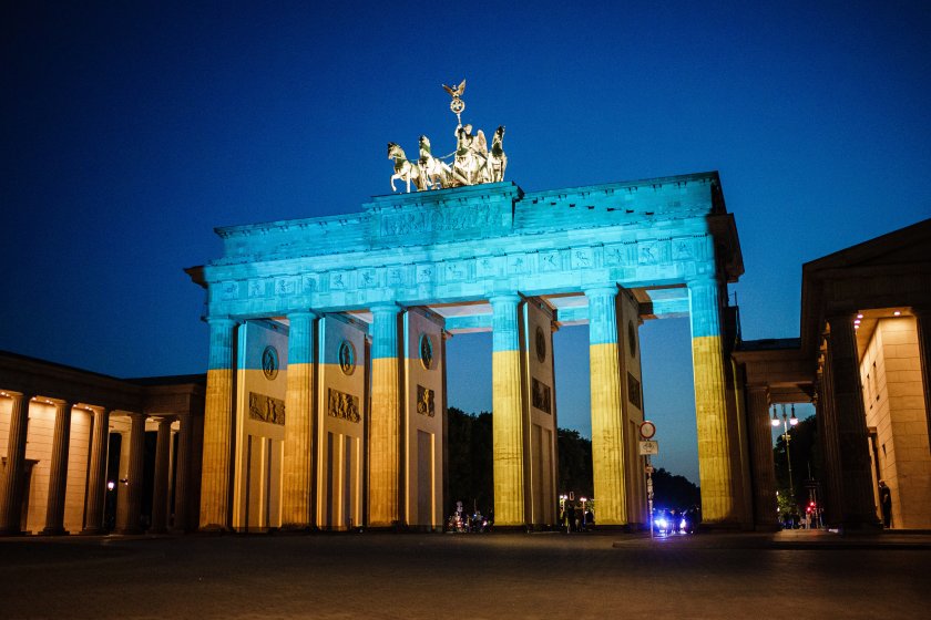 В синьо и жълто светна и Бранденбургската врата в Берлин, където в този миг бяха френският президент Еманюел Макрон и немският канцлер Олаф Шолц.