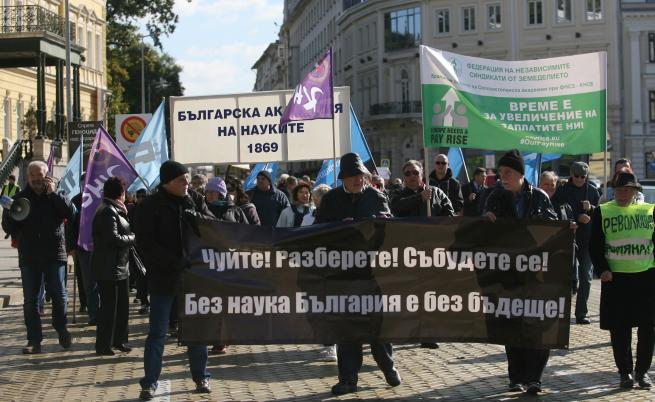 В Денят на националните будители хиляди учени от Българска академия на науките и Селскостопанската академия минаха на протестно шествие в центъра на София поради ниското си възнаграждение и неприятните условия на труд.