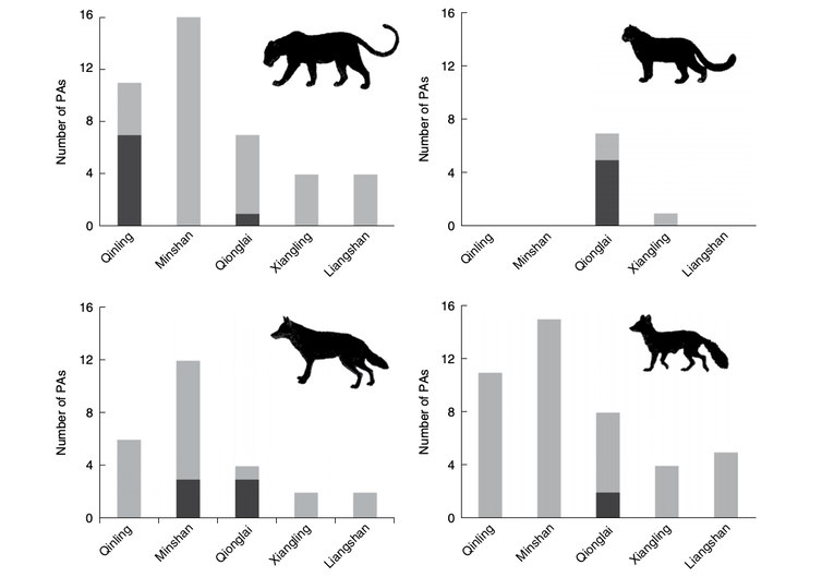 Техният брой е намалял доста в тези резервати. Леопардите са изчезнали от 81% от местообитанията на пандата, снежните леопарди - от 38%, вълците - от 77%, и азиатските диви кучета - от 95% от тях.