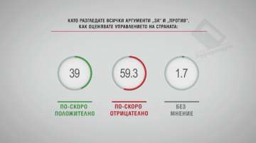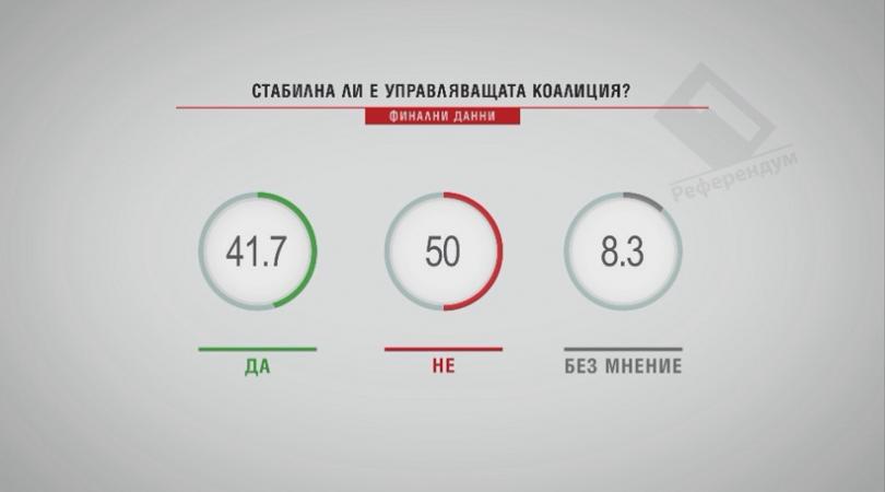 В допитване, осъществено от „ Алфа рисърч “ особено за „ Референдум “, 41,7% от интервюираните правят оценка ръководещата коалиция за постоянна, до момента в който за 50% от тях не е постоянна. За 59,3% от интервюираните ръководството на страната може да се оцени като негативно, до момента в който за 39% от тях то е позитивно. 67,6% правят оценка негативно дейностите на най-голямата опозиционна партия Българска социалистическа партия, до момента в който за 28,1% те са позитивни. Мнозинството от интервюираните - 68% - не чакат обстановката в страната да докара до предварителни избори, а 31,5% от тях са на противоположното мнение.