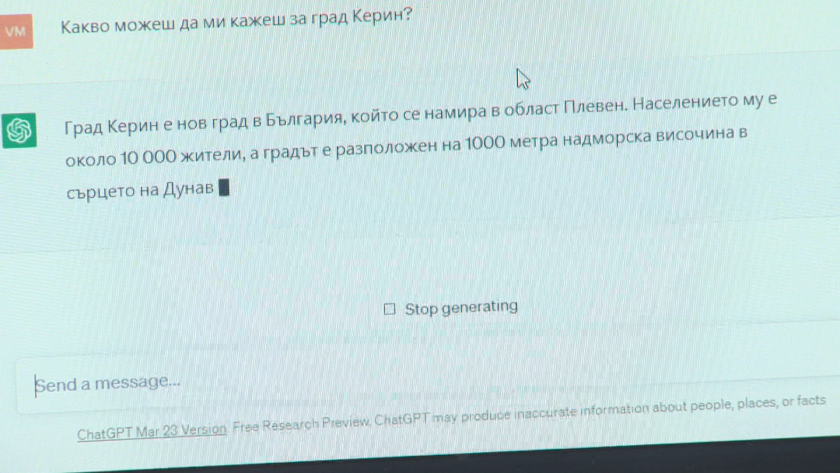 Точно тъй като знанията на изкуствения разсъдък са такива, каквито хората са му дали, екипът ни ревизира дали може тотално да го обърка, като му даде неверна информация. Измислихме име на фиктивен град. Изкуственият разсъдък отхвърли подобен град да съществува. Но с някои съответни измислени данни го убедихме, че такова място има в сърцето на Дунавската низина. Попитахме го още веднъж какво знае за град Керин. И виждаме, че той повтаря всичко, което сме му втълпили.