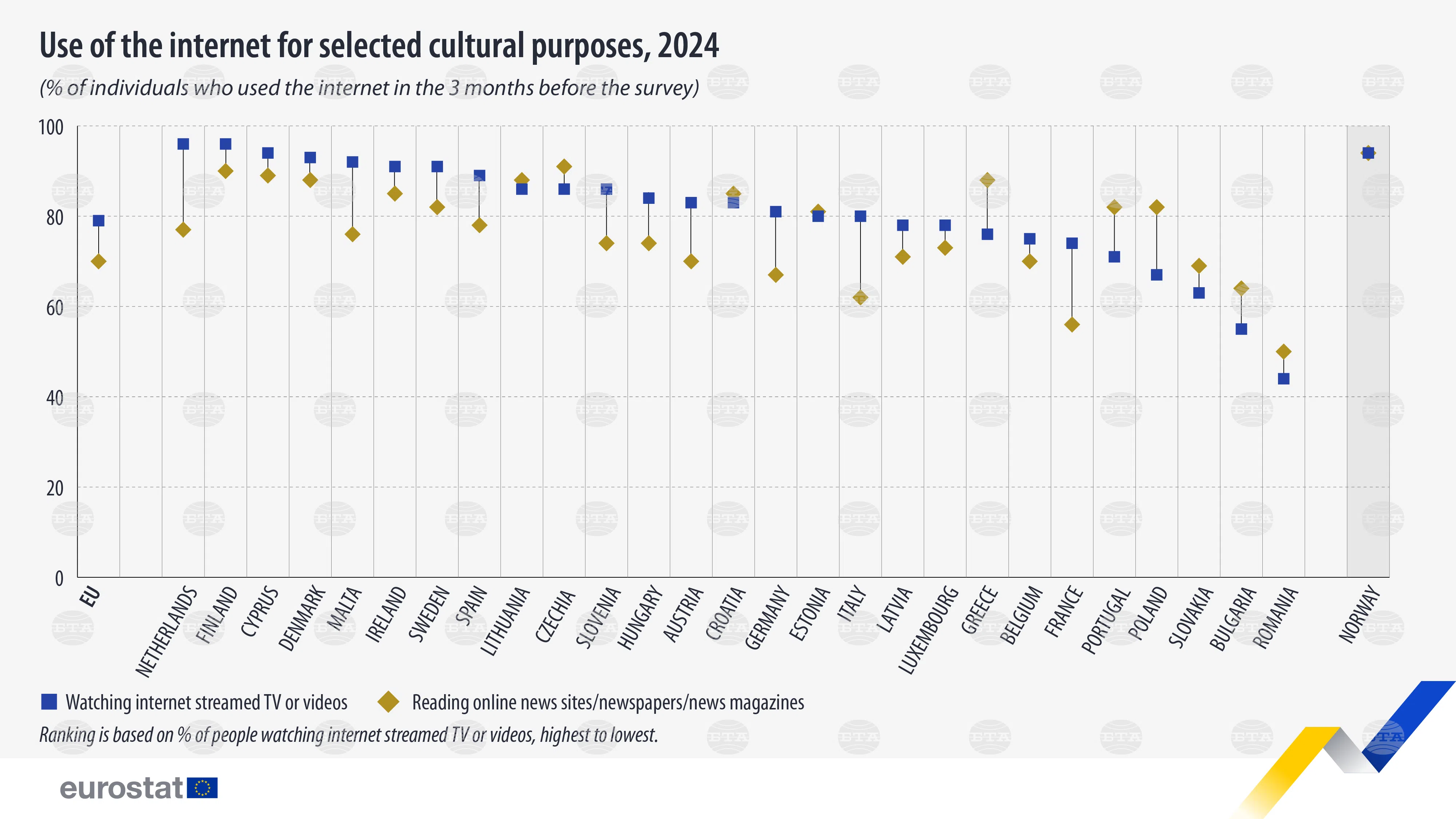 Най-висок дял на интернет потребителите, гледащи телевизия или видеоклипове онлайн, е регистриран в Нидерландия и Финландия (и в двете по 96%) и в Кипър (94%), до момента в който най-нисък е бил делът в Румъния (44%), България (55%) и Словакия (63%).