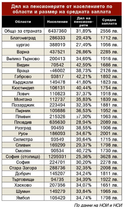 В Габрово, Кърджали, Кюстендил, Видин и Смолян популацията е най-вече от пенсионери. Това демонстрират данни на Национален осигурителен институт и на Национален статистически институт. В тези пет области над 40% от хората взимат пенсии. Характерни за множеството от тези области са ниските заплати и обезлюдяването.