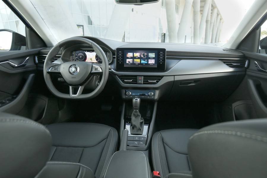 Влизайки в салона на Skoda Scala прелестно съм сюрпризиран от новото оформление на интериора, което до момента не е познато от други модели на марката. Обяснимо в най-високото равнище на съоръжение Style материалите в интериора са доста качествени, а сглобката е смайващо прецизна, тъй че всички фуги са идентични. Точно пред мен е подложен 10,25-инчов дигитален виртуален кокпит, който се появи за първи път при второто потомство на Audi Q7. Воланът е полегат в долната си част, а някои от детайлите са познати от последните модели на Volkswagen. На централната подпора се намира 9,2-инчовият сензорен екран на мултимедийната система, който в базовата версия е 6,5-инчов. В салона има доста отделения за предмети, дълбоки ниши във вратите, джобове в гърбовете на предните седалки и жабка с размер 6 литра.