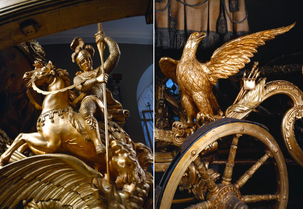 Задните колела са украсени с фигури на Георги Победоносец, убиващ змея, а предните колела са с орли.