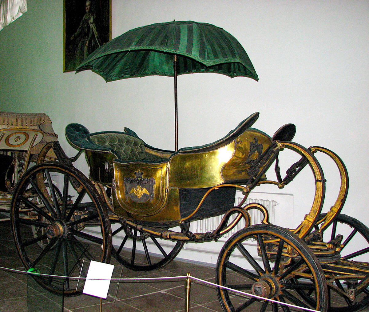 Тази дребна двойна колесница от махагон е направена през 1730 година и принадлежи на Анна Ивановна. Императрицата обаче не пътува на далечни дистанции с нея, а я употребява единствено за разходки в парка на двореца.