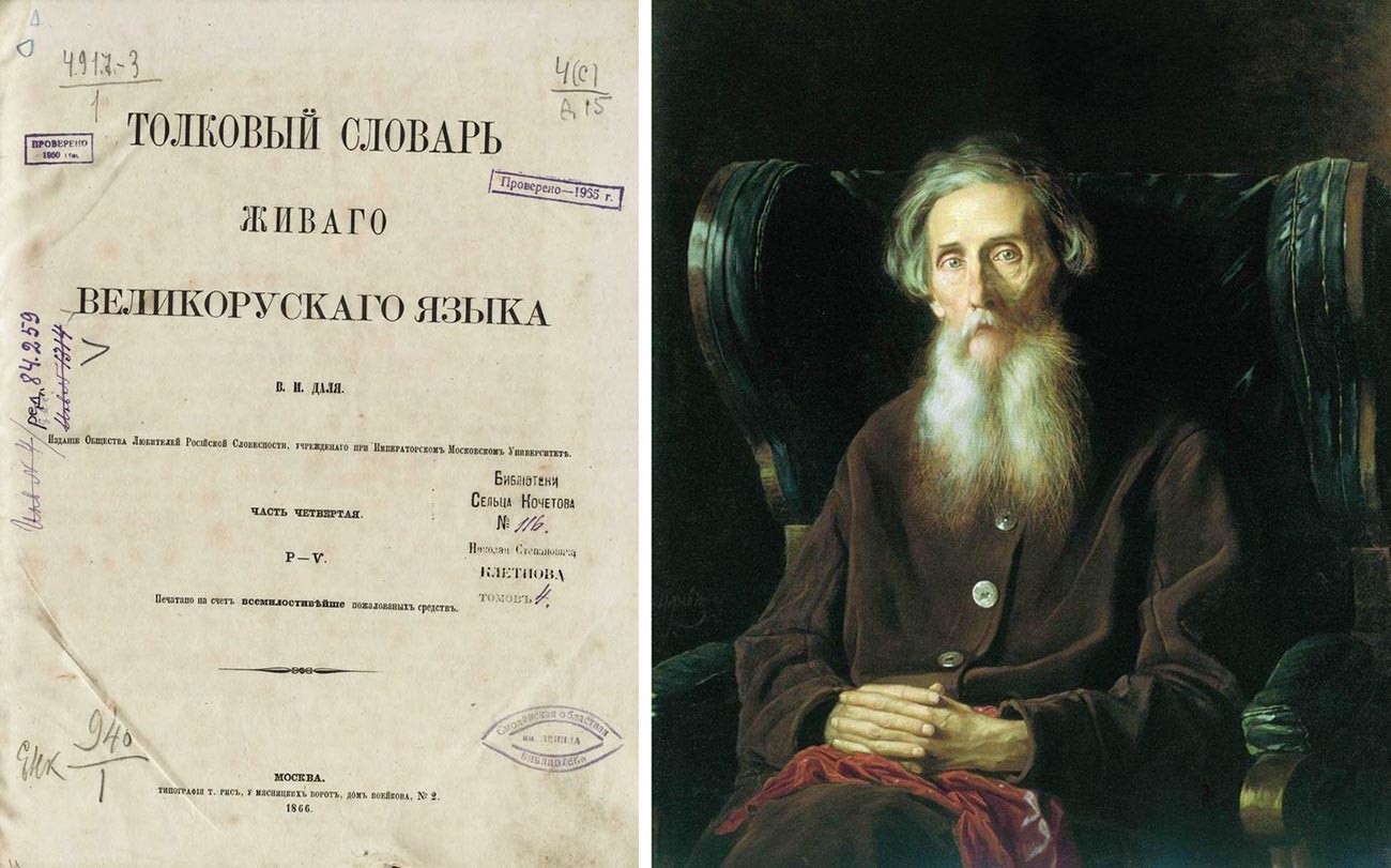 „ Тълковен речник на живия великоруски език “, В. И. Дал. Първо издания (1863-1866), част 4., вдясно – Портрет на писателя Владимир Иванович ДалPublic domain; Василий Перов