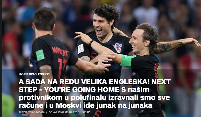 В Хърватия са на върха на щастието след напредъка на националния отбор на Мондиала в Русия. “Ватрените” към този момент си подсигуряваха присъединяване на полуфиналите, където техен противник ще са англичаните. “На дневен ред към този момент идва великата Англия. Следващата стъпка - отивате си вкъщи”, написа “Sportske Novosti”.
