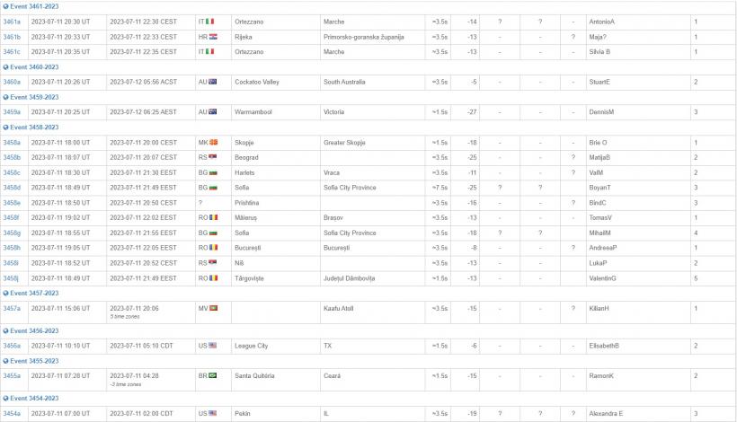 От данните излиза наяве, че сигнали за астероиди е имало в Ниш - 20:52 ч, румънския град Търговище - 21:49, от района на Враца - 21:30 ч, край София - 21:49 ч, край Брашов - 22:02 ч, още веднъж край София - 21:55 ч, в Букурещ - 22:05 ч.